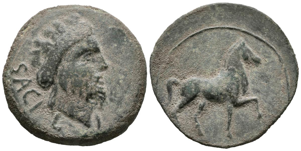 SACILI (Pedro Abad, Córdoba). As. (Ae. 18,16g/32mm). 120-50 a.C. Anv: Cabeza barbada a derecha, detrás leyenda: SACILI. Rev: Caballo al paso a derecha. (FAB-2019). MBC+. Perfilado y repatinado.