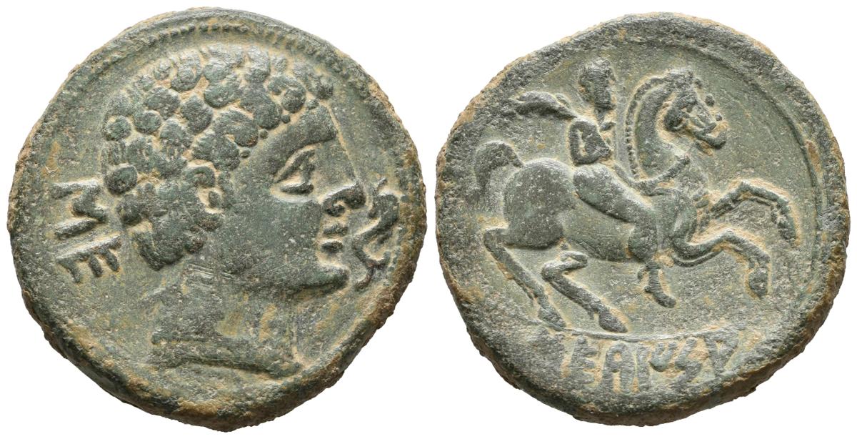 SECAISA (Zona de Aragón). As. (Ae. 17,79g/30mm). 120-20 a.C. Anv: Cabeza masculina a derecha, delante delfín, detrás letras ibéricas: SE. Rev: Jinete con palma a derecha, debajo leyenda ibérica: SECaISA. MBC/MBC+.