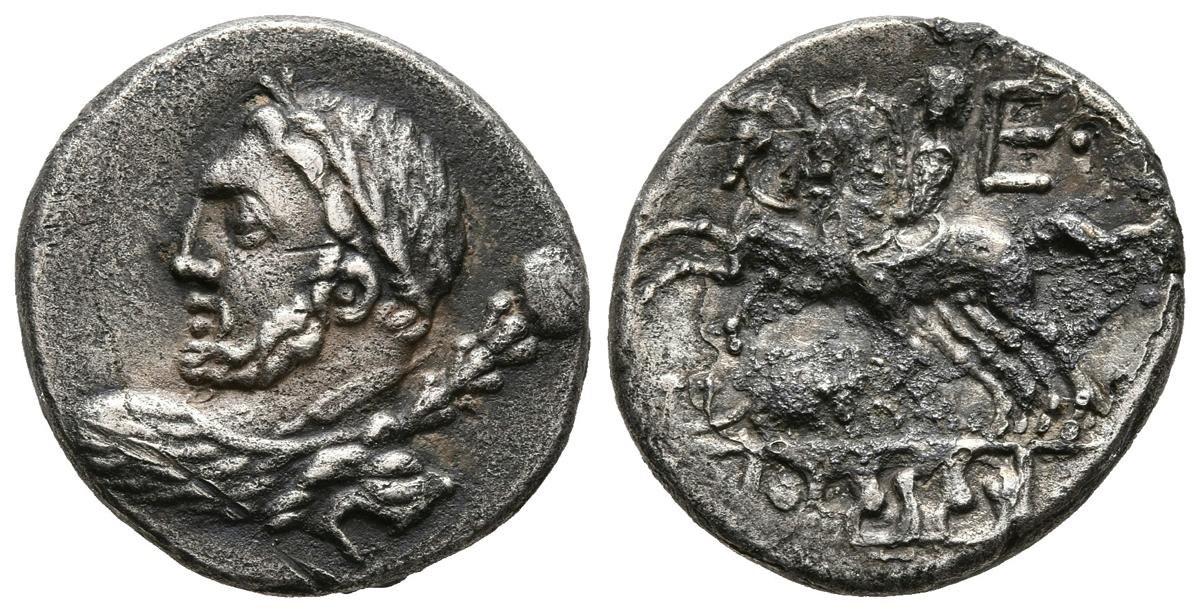 GENS QUINCTIA. Denario. (Ae. 3,51g/19mm). 112-111 a.C. Italia central. Anv: Busto de Hércules a izquierda portando maza. Rev: Jinete conduciendo biga, debajo rata entre T-Q, encima E, debajo leyenda D.S.S. (Crawford 297/1; FFC 1085). MBC. Oxidaciones limpiadas.
