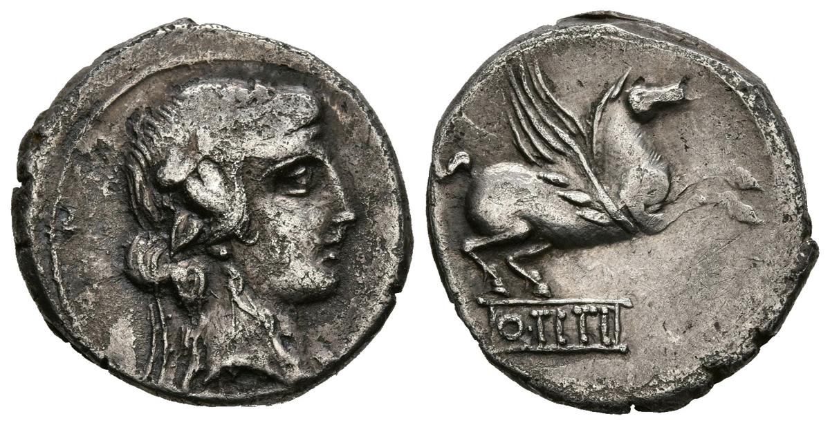 GENS TITIA. Denario. (Ar. 3,84g/18mm). 90 a.C. Italia central. Anv: Cabeza de Baco jóven a derecha. Rev: Pegaso a derecha, debajo: Q. TITI. dentro de una tablilla. (Crawford 341/2; FFC 1143). MBC+.
