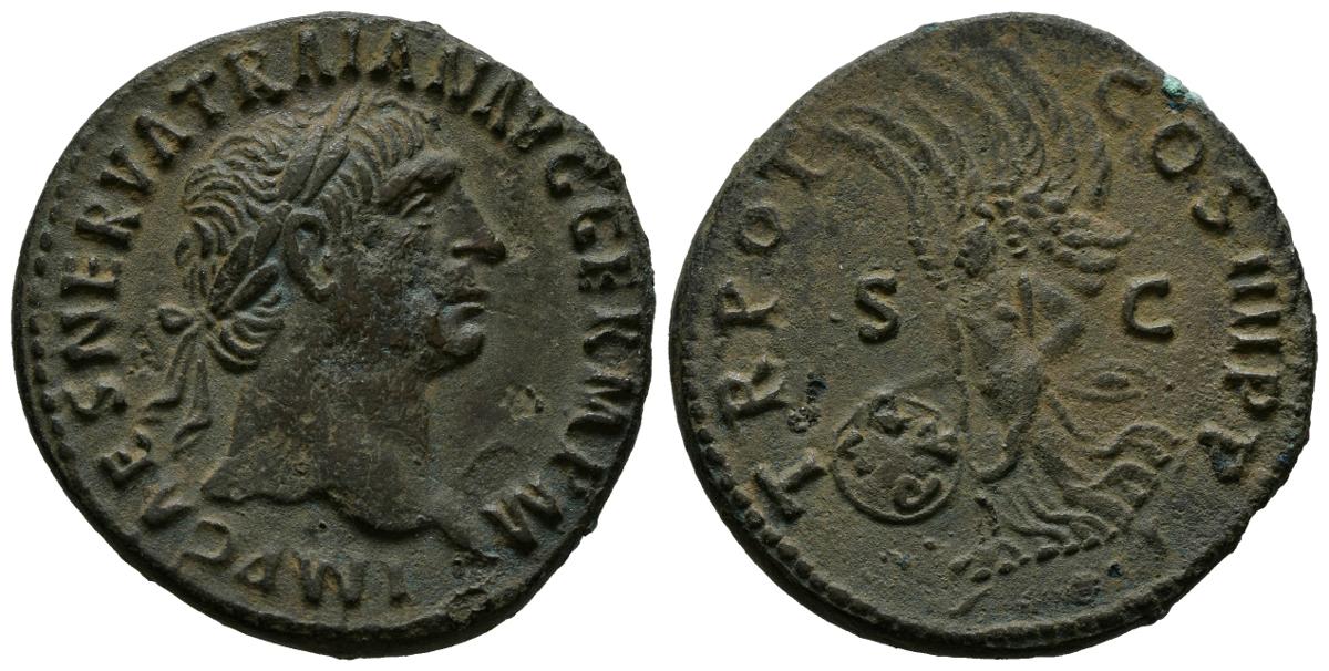 TRAJANO. (Ae. 9,35g/27mm). 99-102 d.C. Roma. Anv: IMP CAES NERVA TRAIAN AVG GERM P M. Busto laureado a derecha de Trajano. Rev: TR POT COS IIII P P. Victoria avanzando a izquierda portando un escudo con inscripción: SPQR. (RIC 434). MBC+. Campos rebajados.