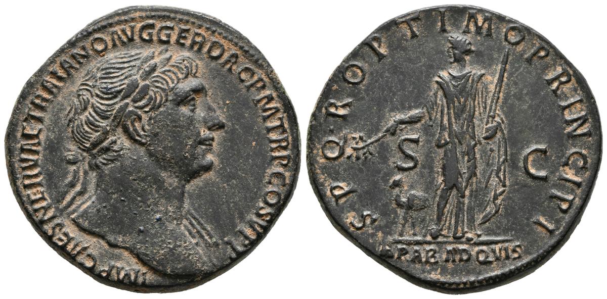 TRAJANO. Sestercio. (Ae. 23,47g/32mm). 103-111 d.C. Roma. Anv: IMP CAES NERVAE TRAIANO AVG GER DAC P M TR P COS V P P. Busto laureado con ligero drapeado sobre hombro izquierdo a derecha de Trajano. Rev: SPQR OPTIMO PRINCIPI. Arabia estante a izquierda portando rama de olivo y cetro sosteniendo falda, delante camello, entre S-C, en exergo: ARAB ADQVIS. (RIC 466). MBC+. Campos repasados.