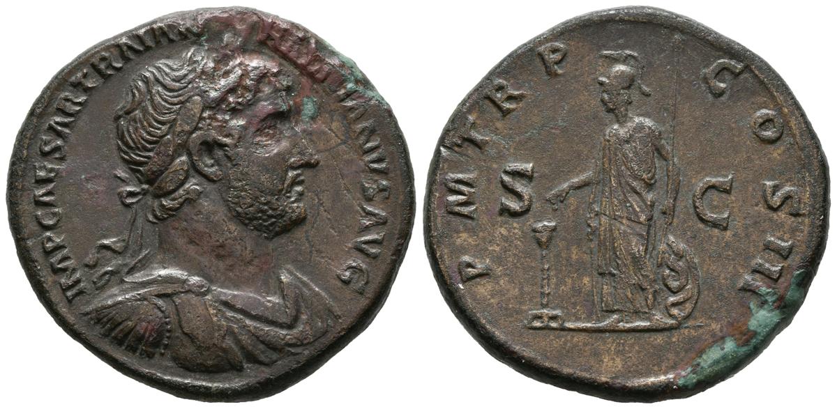 ADRIANO. Sestercio .(Ae. 25,45g/34mm). 119-121 d.C. Roma. Anv: IMP CAESAR TRAIAN HADRIANVS AVG. Busto laureado, drapeado y con coraza a derecha de Adriano. Rev: P M TR P COS III. Minerva estante a izquierda portando cetro, echando incienso en candelabro, detrás serpiente trepando por escudo a sus pies. Entre S-C. (RIC 668). MBC+. Campos rebajados.
