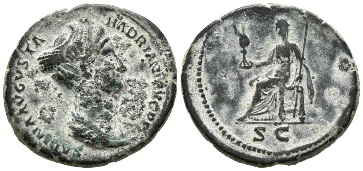 SABINA. As. (Ae. 9,49g/27mm). 128-134 d.C. Roma. Anv: SABINA AVGVSTA HADRIAN AVG P P. Busto drapeado con pelo recogido a derecha. Rev: Vesta sentada a izquierda portando paladio y cetro, en exergo SC. (RIC 1024). MBC. Campos rebajados y repatinado.