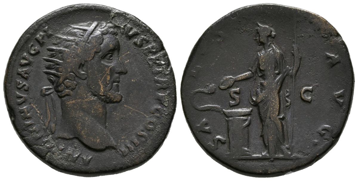 ANTONINO PIO. Dupondio. (Ae. 10,61g/27mm). 151-152 d.C. Roma. Anv: ANTONINVS AVG PIVS PP TR P COS III. Busto radiado a derecha de Antonino Pío. Rev: Salus estante a izquierda portando cetro alimentando serpiente de patera. (RIC 894). MBC-. Campos rebajados.