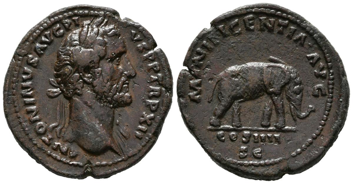 ANTONINO PIO. As. (Ae. 13,65g/28mm). 148-149 d.C. Roma. Anv: ANTONINVS AVG PIVS P P TR P XII. Busto laureado a derecha de Antonino Pío. Rev: MVNIFICENTIA AVG. Elefante a derecha, en exergo COS IIII SC. (RIC 862a). MBC+. Campos rebajados.