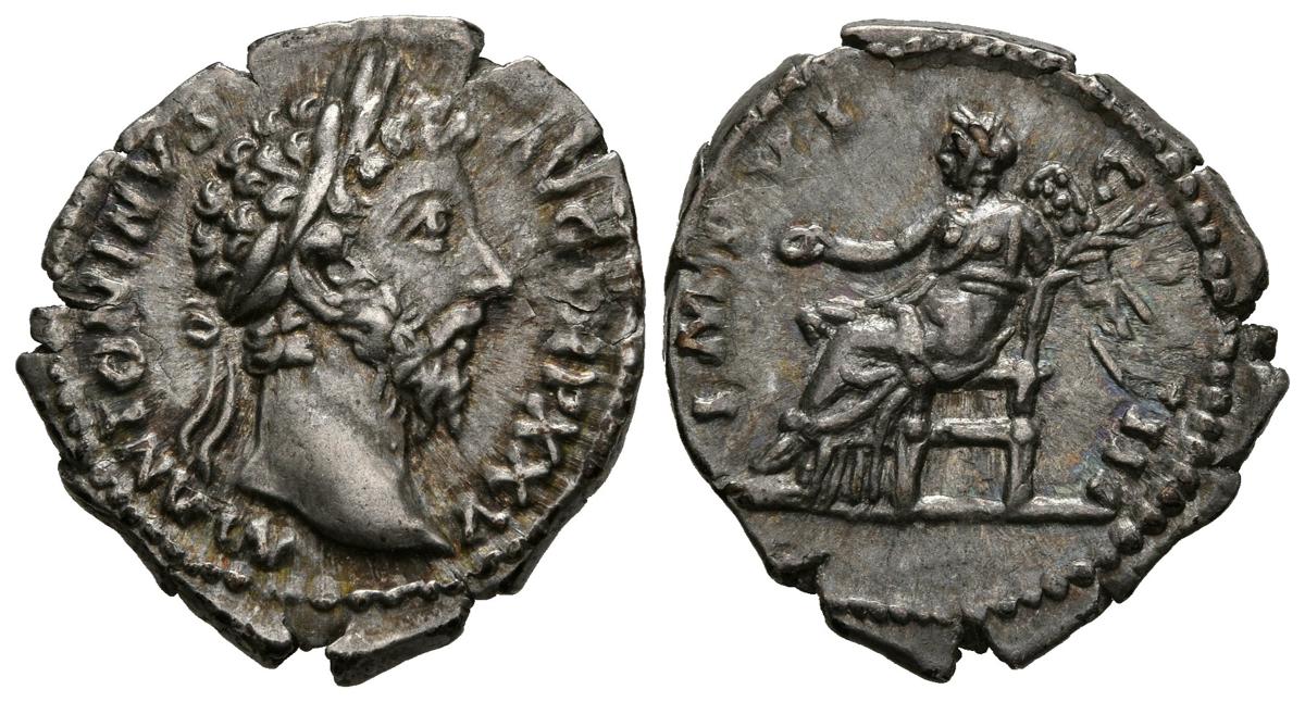 MARCO AURELIO. Denario. (Ar. 3,26g/20mm). 174-175 d.C. Roma. Anv: M ANTONINVS AVG P M TR P XXV. Busto laureado a derecha de Marco Aurelio. Rev: IMP VI COS III. Victoria sentada a izquierda portando patera y palma. (RIC 239). MBC.