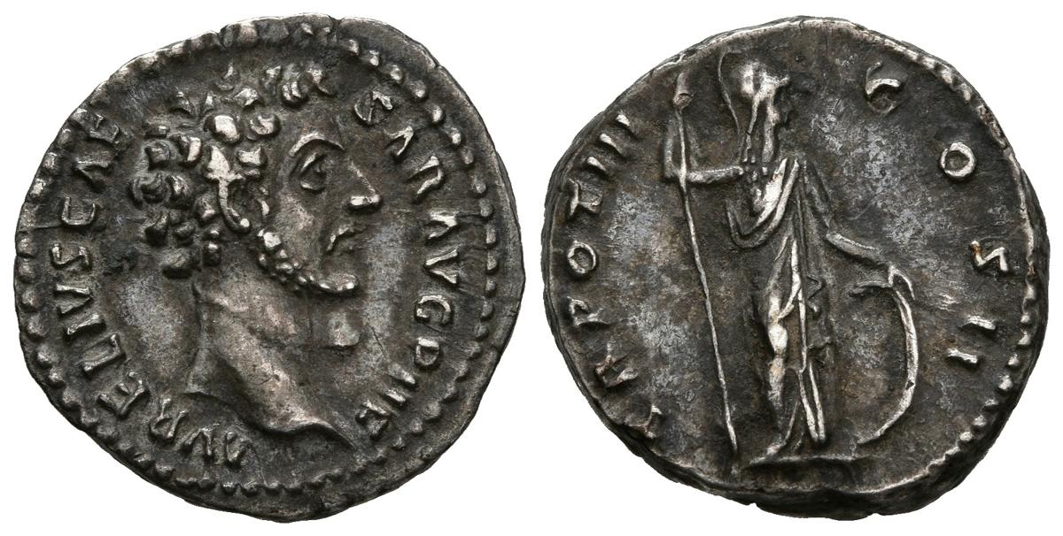MARCO AURELIO. Denario. (Ar. 3,52g/18mm). 148-149 d.C. Roma. Anv: AVRELIVS CAESAR AVG P II F. Busto desnudo a derecha de Marco Aurelio. Rev: TR POT III COS II. Minerva estante a derecha portando cetro y escudo. (RIC 444). MBC+.