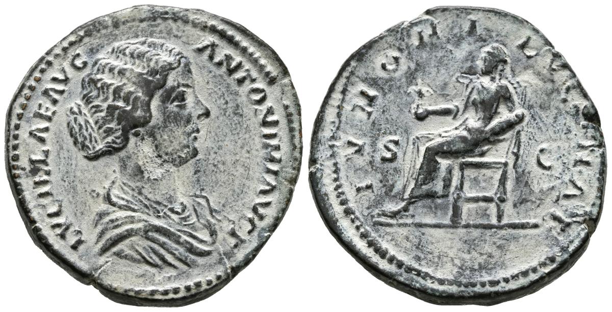 LUCILLA. Sestercio. (Ae. 21,90g/32mm). 182 d.C. Roma. Anv: LVCILLAE AVG ANTONINI AVG F. Busto drapeado con moño a derecha de Lucilla. Rev: IVNO LVCINAE. Juno sentado a izquierda sosteniendo flor, entre SC. (RIC 1747). MBC-. Campos rebajados y repatinado.
