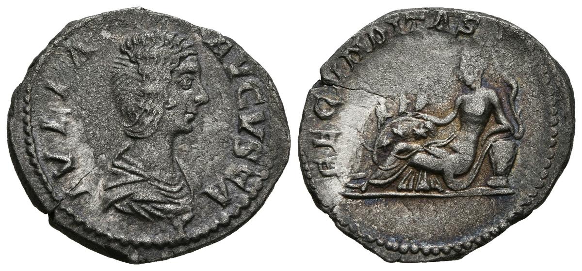 JULIA DOMNA. Denario. (Ar. 3,01g/20mm). 207-211 d.C. Roma. Anv: IVLIA AVGVSTA. Busto drapeado a derecha de Julia Domna. Rev: FECVNDITAS. Fecunditas tumbada a izquierda bajo árbol con el brazo apoyado sobre cesta de fruta, delante cuatro niños, que representan las cuatro estaciones. (RIC 549). MBC.