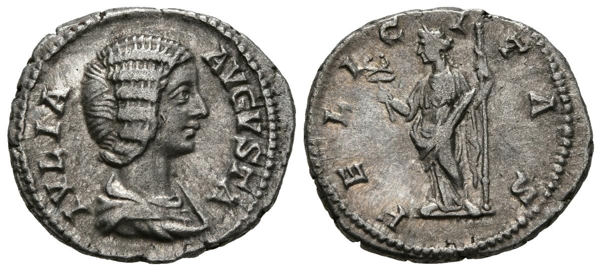 JULIA DOMNA. Denario. (Ar. 3,44g/19mm). 206 d.C. Roma. Anv: IVLIA AVGVSTA. Busto drapeado con pelo recogido a derecha de Julia Domna. Rev: FELICITAS. Felicitas estante a izquierda portando caduceo y cetro. (RIC 551). MBC.