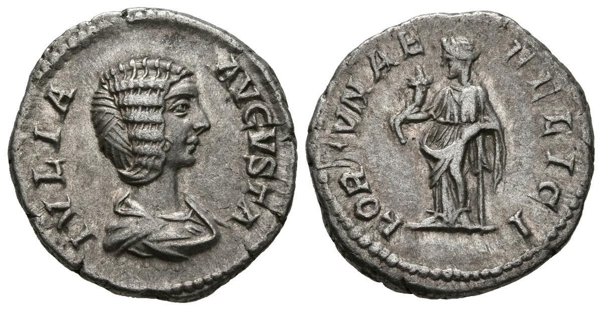 JULIA DOMNA. Denario. (Ar. 3,35g/19mm). 207-211 d.C. Roma. Anv: IVLIA AVGVSTA. Busto drapeado a derecha de Julia Domna. Rev: FORTVNAE FELICI. Fortuna estante a izquierda portando cornucopia. (RIC 552). MBC+.