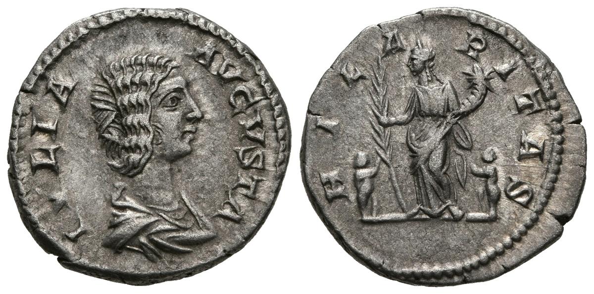 JULIA DOMNA. Denario. (Ar. 3,36g/19mm). 196-211 d.C. Roma. Anv: IVLIA AVGVSTA. Busto drapeado a derecha de Julia Domna. Rev: HILARITAS. Hilaritas estante a izquierda portando palma y cornucopia, a ambos lados niños y en campo estrella. (RIC 557 var). MBC.