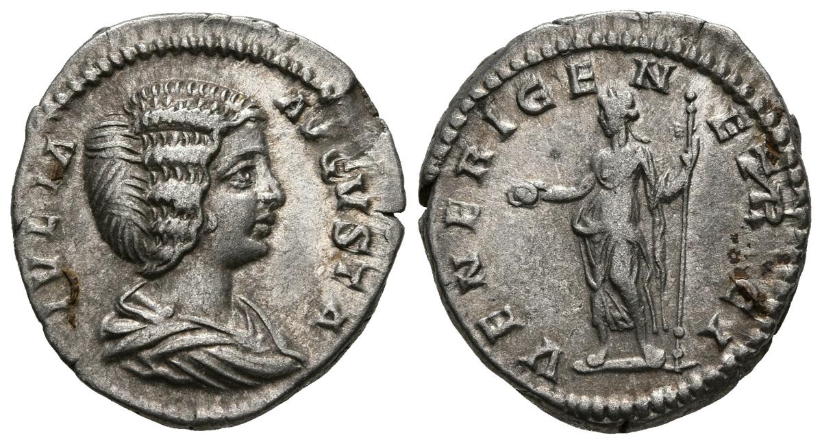 JULIA DOMNA. Denario. (Ar. 3,40g/19mm). 196-211 d.C. Roma. Anv: IVLIA AVGVSTA. Busto drapeado a derecha de Julia Domna. Rev: VENERI GENETRICI. Venus estante a izquierda portando patera y cetro. (RIC 578). MBC+.