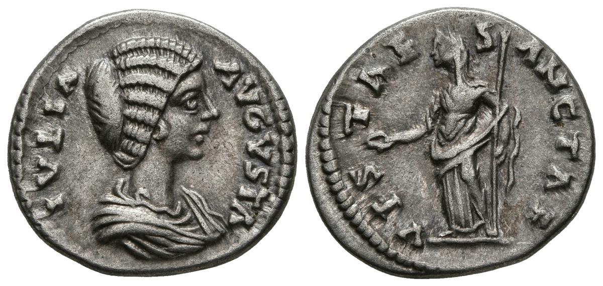 JULIA DOMNA. Denario. (Ar. 3,30g/19mm). 196-202 d.C. Roma. Anv: IVLIA AVGVSTA. Busto drapeado a derecha de Julia Domna. Rev: VESTAE SANCTAE. Vesta estante a izquierda portando patera y cetro. (RIC 648). MBC+.