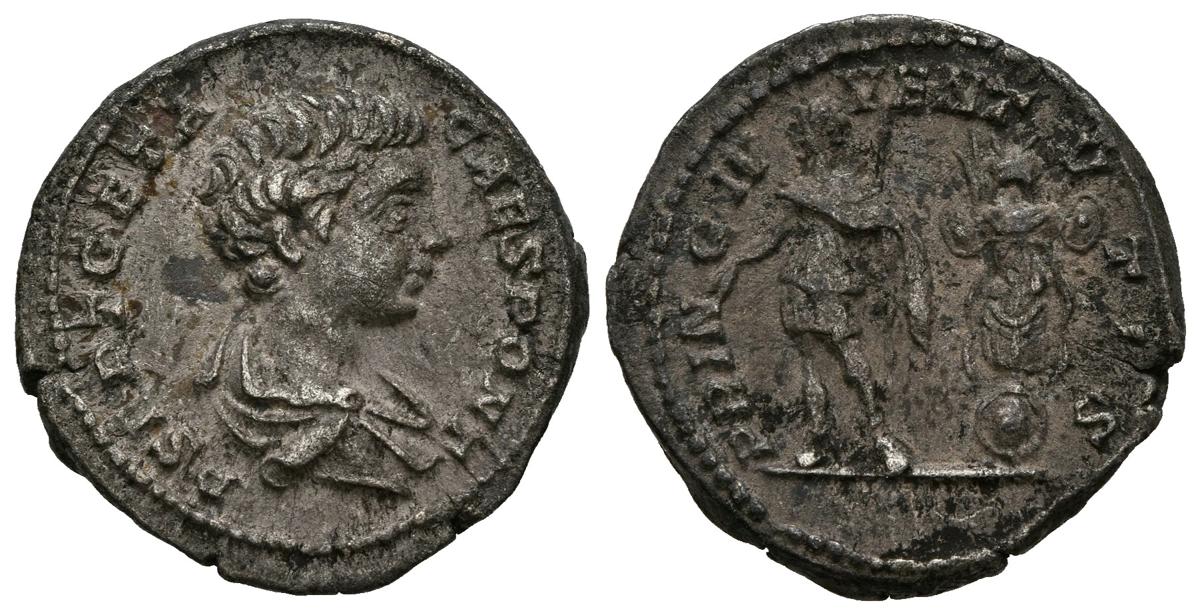 GETA. Denario. (Ar. 3,16g/19mm). 200-202 d.C. Roma. Anv: P SEPT GETA CAES PONT. Busto drapeado a derecha de Geta. Rev: PRINC IVVENTVTIS. Geta con atuendo militar estante a izquierda portando rama y cetro, detrás trofeo de armas. (RIC 18). MBC+.