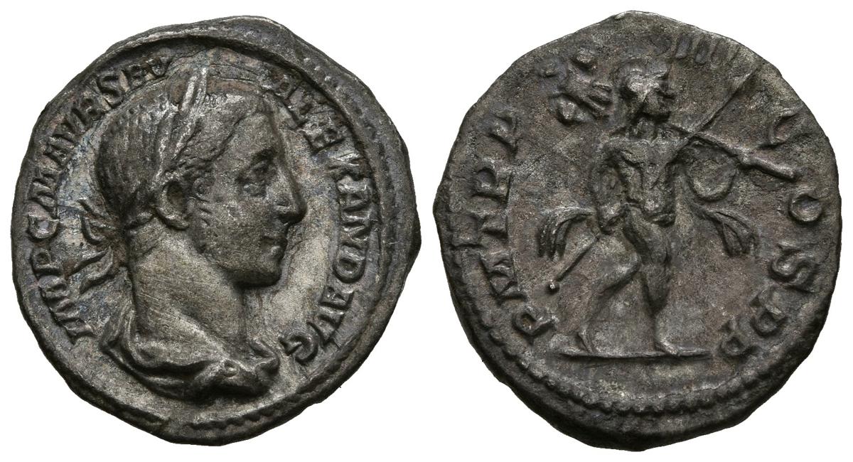 ALEJANDRO SEVERO. Denario. (Ar. 2,28g/19mm). 228 d.C. Roma. Anv: IMP C M AVR SEV ALEXAND AVG. Busto laureado y drapeado a derecha de Alejandro Severo. Rev: P M TR P IIII COS P P. Marte avanzando a derecha portando lanza y trofeo. (RIC 45). MBC.