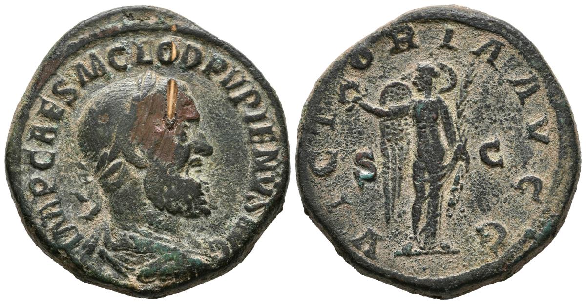 PUPIENO. Sestercio. (Ae. 23,80g/31mm). 238 d.C. Roma. Anv: IMP CAES M CLOD PVPIENVS AVG. Busto laureado y drapeado a derecha de Pupieno. Rev: VICTORIA AVGG. Victoria estante a izquierda portando corona y palma, entre S-C. (RIC 23a). MBC-. Campos rebajados y repatinado. Prueba de metal en anverso.