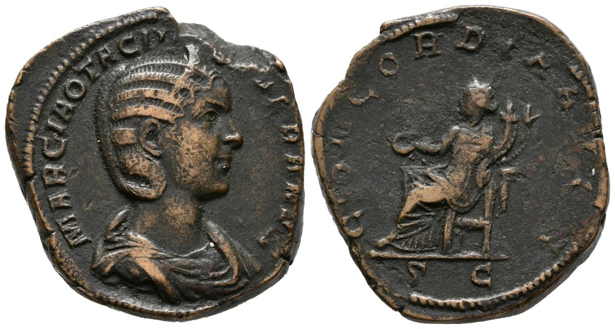 OTACILIA SEVERA. Sestercio. (Ae. 21,50g/32mm). 244-249 d.C. Roma. Anv: MARCIA OTACIL SEVERA AVG. Busto diademado y drapeado de Otacilia Severa. Rev: CONCORDIA AVG. Concordia sentada a izquierda portando patera, en exergo SC. (RIC 203a). MBC. Campos rebajados.