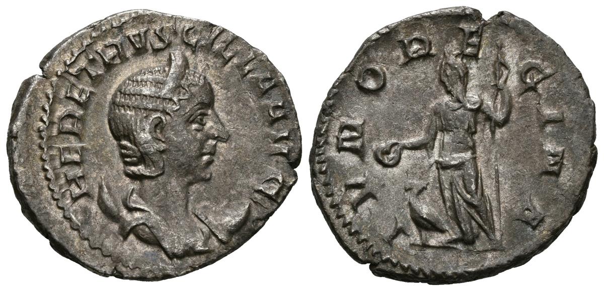 HERENNIA ETRUSCILLA. Antoniniano. (Ar. 3,72g/22mm). 249-251 d.C. Roma. Anv: HER ETRVSCILLA AVG. Busto diademado y drapeado a derecha de Herennia Etruscilla sobre creciente. Rev: IVNO REGINA. Juno estante a izquierda portando patera y cetro, a sus pies águila. (RIC 57). MBC+.