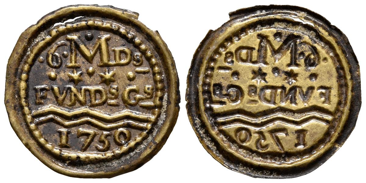 BARCELONA, Santa María del Mar. Pellofa. (La. 0,22g/19mm). 1750. (Cru.L. 1226). Valor de 6Ds. EBC-. Repatinada.