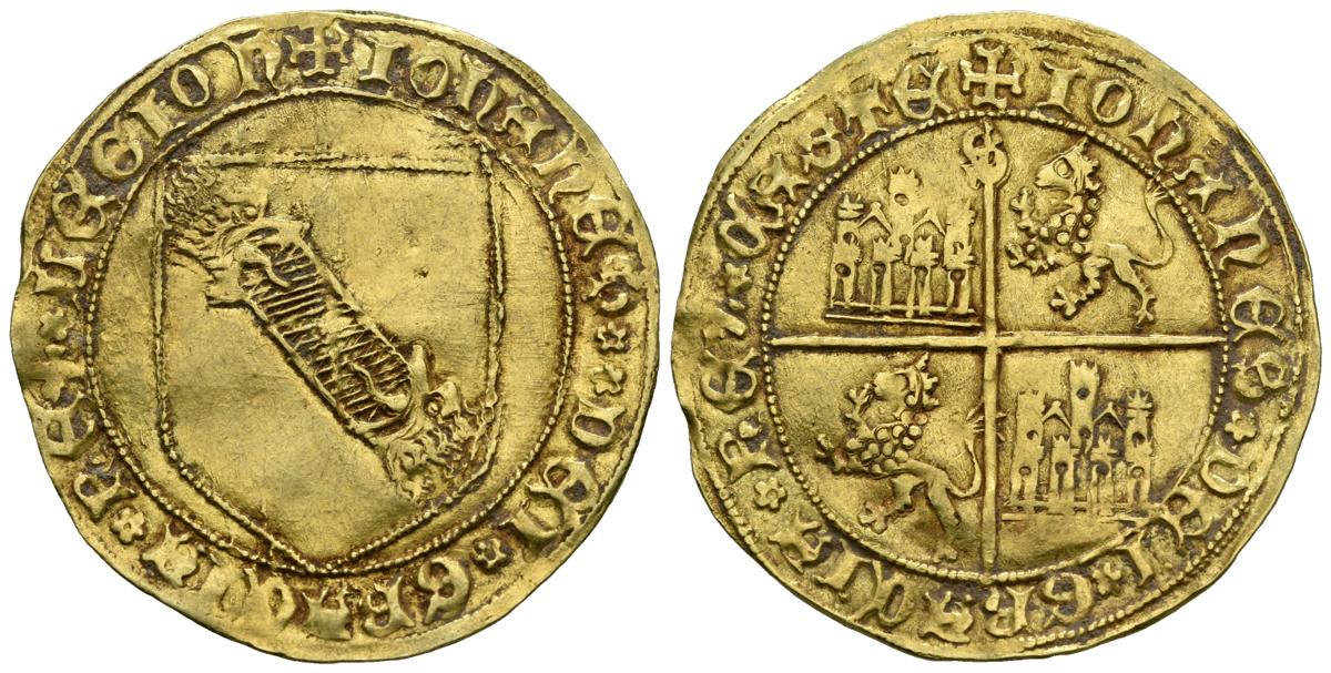 JUAN II (1406-1454). Dobla de la banda. (Au. 4,59g/33mm). Sevilla. Anv: Escudo de la banda con leones en los extremos, todo dentro de gráfila circular, alrededor leyenda: IOHANES DEI GRACIA REX LEGION. Rev: Cuartelado de castillos y leones coronados y rampantes a izquierda, todo dentro de gráfila circular, marca de ceca en el extremo superior, alrededor leyenda: IOHANES DEI GRACIA REX CASTE. (FAB-617.2 var). Variante de leyenda. EBC-.