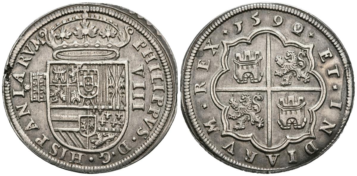 FELIPE II (1556-1598). 8 Reales. (Ar. 27,30g/41mm). 1590/2. Segovia. (Cal-2019-711 var). Ceca de tres arcos y dos pisos con la cabeza de Extremadura encima. MBC+. Raro.
