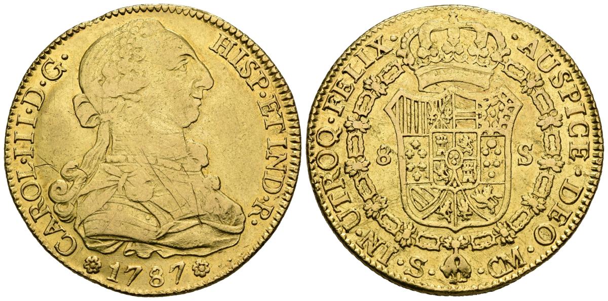 CARLOS III (1759-1788). 8 Escudos. (Au. 26,88g/37mm). 1787. Sevilla CM. (Cal-2019-2193). MBC.