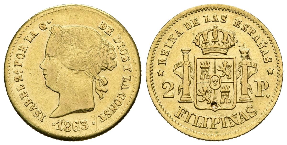 ISABEL II (1833-1868). 2 Pesos. (Au. 3,38g/18mm). 1863. Manila. (Cal-2019-841). MBC+/EBC-. Intento de incisión en reverso.