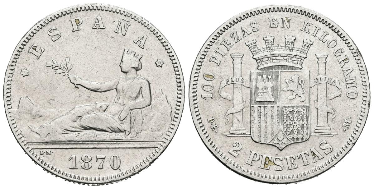 GOBIERNO PROVISIONAL (1868-1871). 2 Pesetas. (Ar. 9,80g/27mm). 1870 *18-75. Madrid DEM. (Cal-2019-33). MBC+. Limpiada.