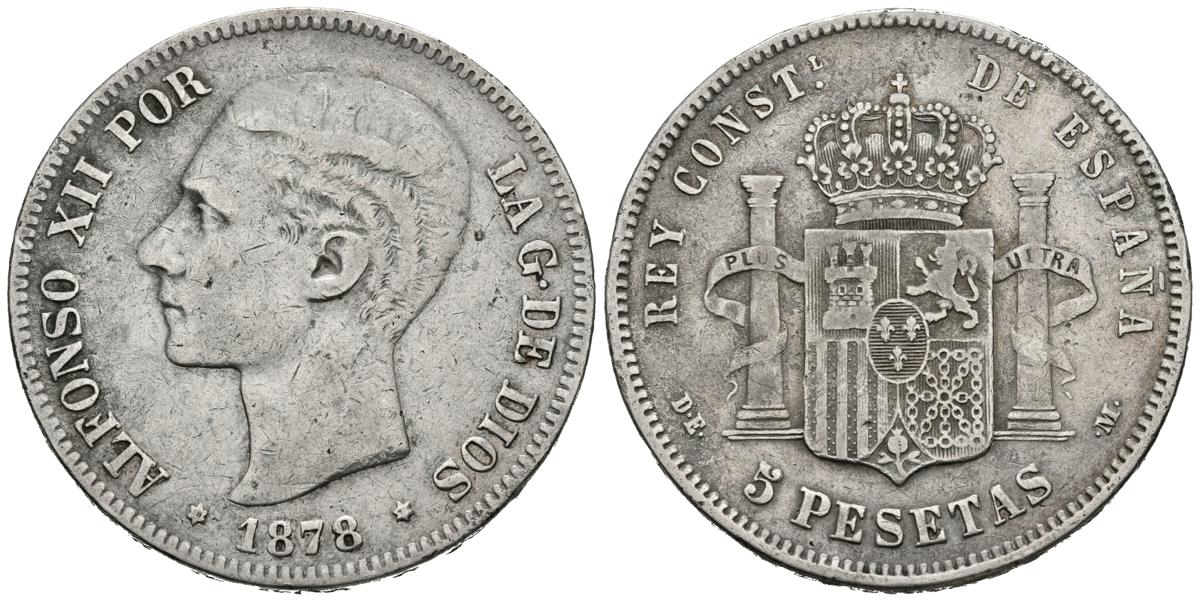ALFONSO XII (1874-1885). 5 Pesetas (Ar. 24.65g/37mm). 1878. Estrellas sólo parcialmente visibles. Madrid. DEM. (Cal-2019-39). MBC.