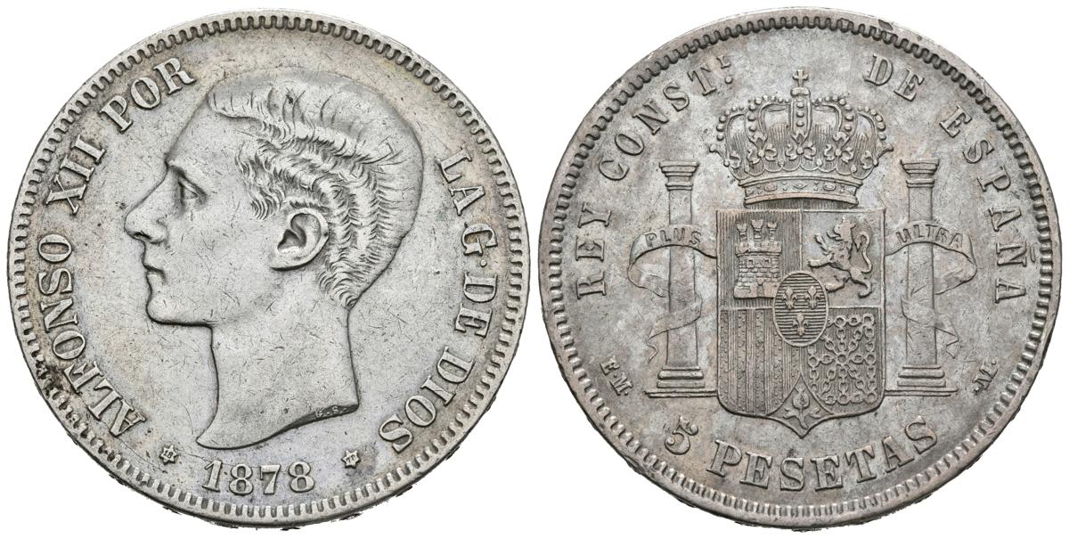 ALFONSO XII (1874-1885). 5 Pesetas. (Ar. 25,06g/37mm). 1878 *18-78. Madrid EMM. (Cal-2019-39). MBC+. Ligero tono irisado en reverso.