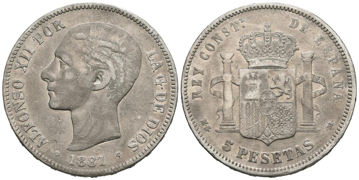 ALFONSO XII (1874-1885). 5 Pesetas. (Ar. 24,87g/38mm). 1881 *18-81. Madrid MSM. (Cal-2019-44). MBC.
