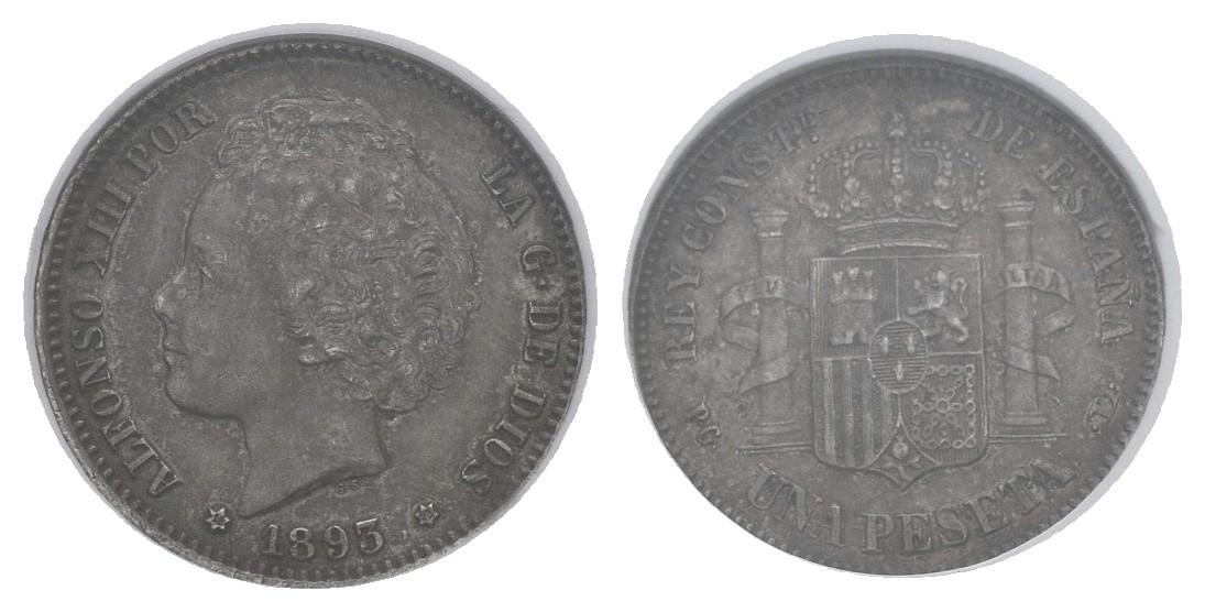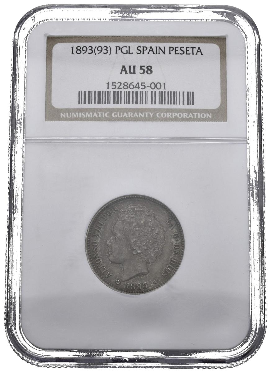 ALFONSO XIII (1885-1931). 1 Peseta. (Ar. 5,00g/23mm)*. 1893 *18-93. Madrid PGL. (Cal-2019-54). EBC+. Encapsulado por NGC AU58. Bonita pátina. Escaso así. *Peso teórico.