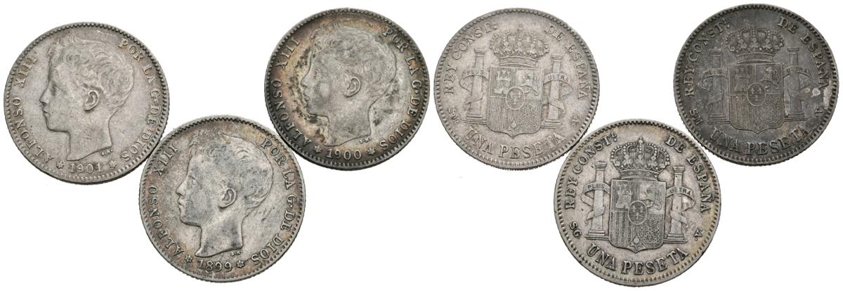 ALFONSO XIII (1885-1931). Conjunto de tres monedas de 1 Peseta de los años 1899, 1900 y 1901. A EXAMINAR.