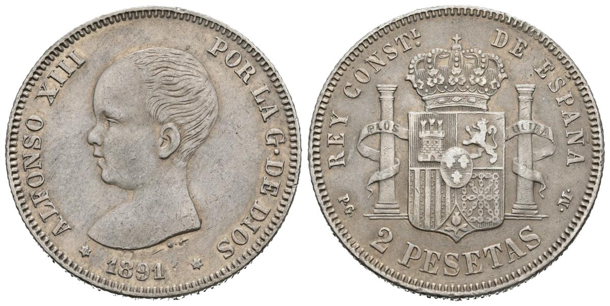 ALFONSO XIII (1885-1931). 2 Pesetas. (Ar. 10,01g /27mm). 1891 *18-91. Madrid PGM. (Cal-2019-84). EBC-. Segunda estrella muy floja. Leve golpecito en el canto. Escasa.