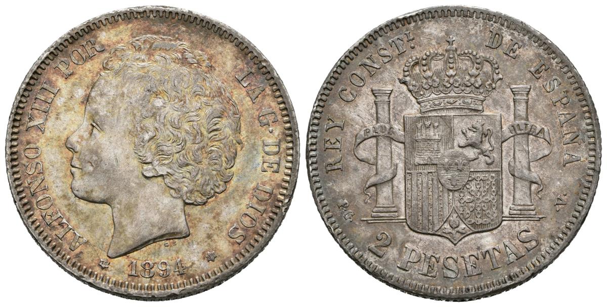 ALFONSO XIII (1885-1931). 2 Pesetas. (Ar. 9,99g/27mm). 1894 *18-94. Madrid PGV. (Cal-2019-86). EBC. Precioso tono irisado. Bonito ejemplar.