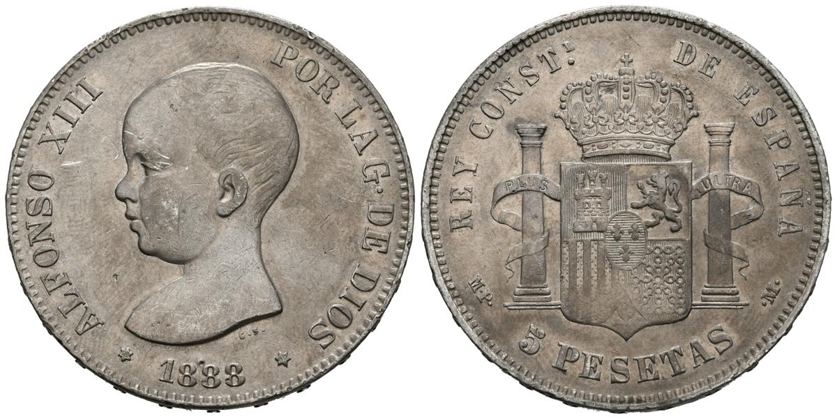 ALFONSO XIII (1885-1931). 5 Pesetas. (Ar. 24,99g/37mm). 1888 *18-88. Madrid MPM. (Cal-2019-90). MBC.