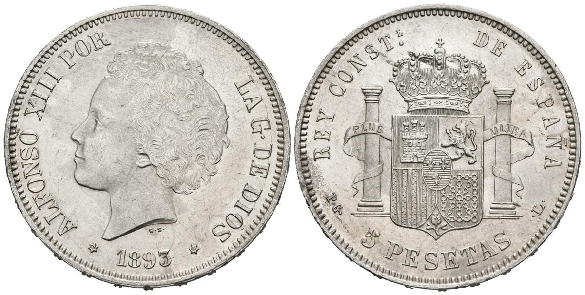 ALFONSO XIII (1885-1931). 5 Pesetas. (Ar. 25,05g/37mm). 1893. Madrid PGL. (Cal-2019-102). SC. Pleno brillo original. Espectacular ejemplar.