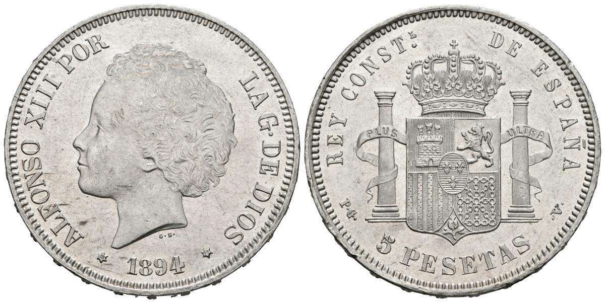 ALFONSO XIII (1885-1931). 5 Pesetas (Ar. 24.96g/37mm). 1894. *18-94. Madrid. PGV. (Cal-2019-104). SC. Brillo original.