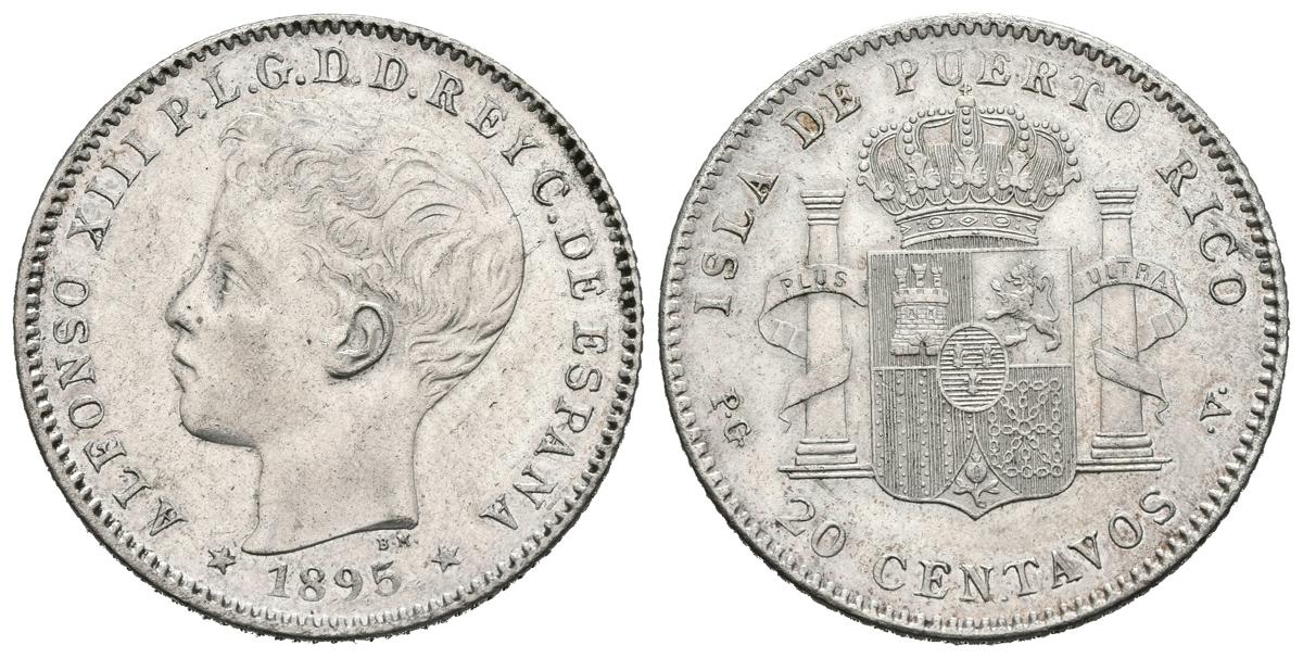 ALFONSO XIII (1885-1931). 20 Centavos. (Ar. 5,00g/32mm). 1896. Puerto Rico. (Cal-2019-126). EBC+. Parte de brillo original. Precioso ejemplar escaso así.