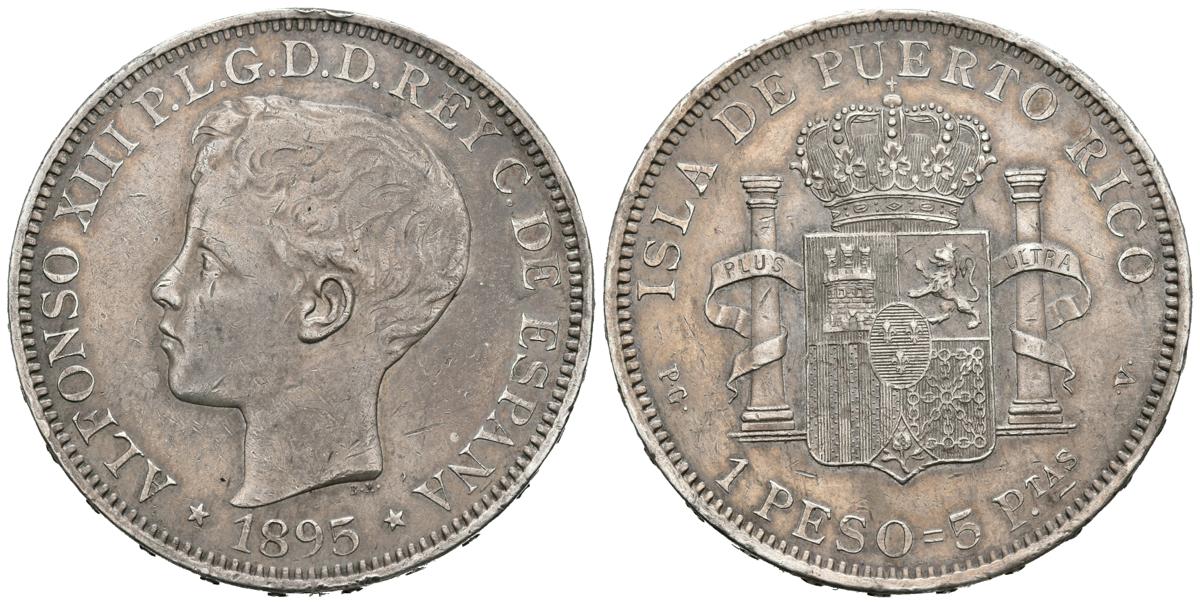 ALFONSO XIII (1885-1931). 1 Peso. (Ar. 24,85g/37mm). 1895. Puerto Rico PGV. (Cal-2019-128). EBC-. Tono irisado. Bonito ejemplar escaso así.