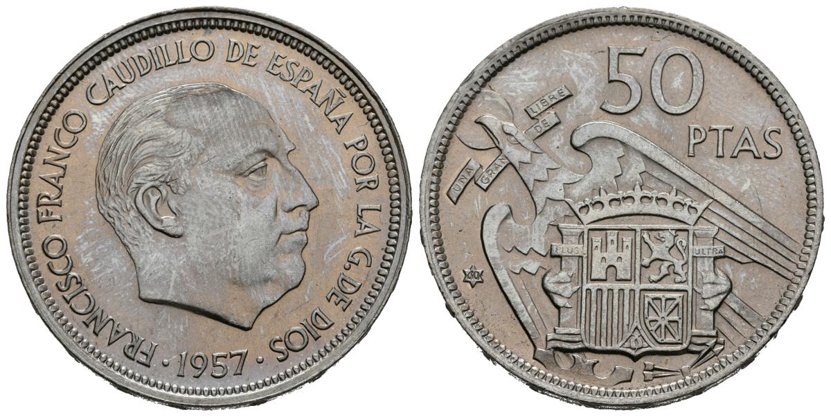 ESTADO ESPAÑOL (1936-1975). 50 Pesetas (Ni. 12,52g/30mm). 1957. *60. Madrid. (Cal-2019-135). SC. Preciosa pátina dorada.