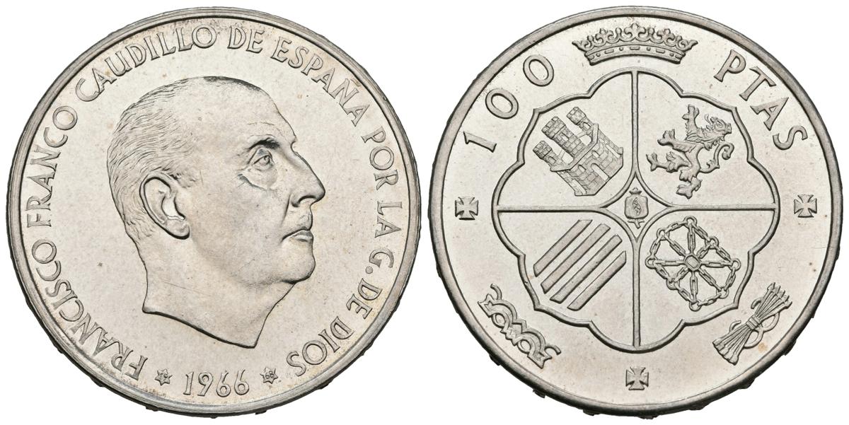 ESTADO ESPAÑOL (1936-1975). 100 Pesetas (Ar. 18.77g/34mm), 1966. *68. Madrid. SC. Brillo espejo. Procedente de tira. Magnífico ejemplar.