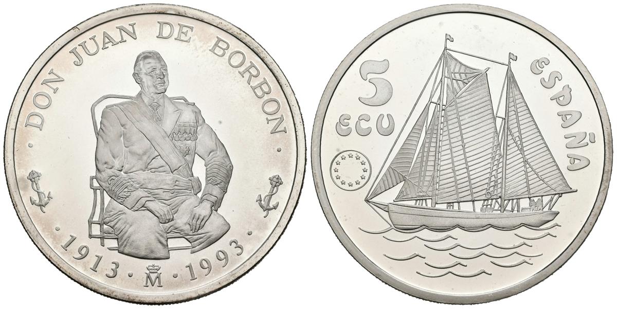 CONTEMPORANEO. 5 Ecu. (Ar. 33,55g/42mm). 1993. FNMT. Saltillo. Don Juan de Borbón 1913-1993. Flor de cuño. Incluye estuche oficial y certificado de autenticidad.