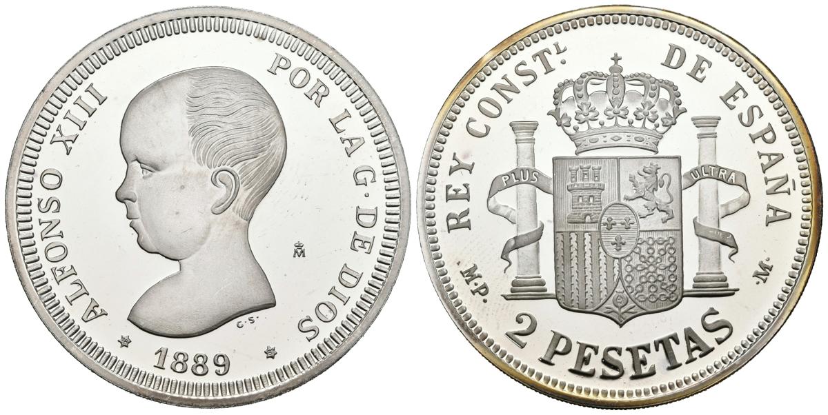 CONTEMPORANEO. 2 Pesetas. (Ar. 27,11g/40mm). 1889. Alfonso XIII. Reproducción actual (años 90) de la FNMT. Perteneciente a la Colección Historia de la Peseta. Madrid. Plata de 925. PROOF.