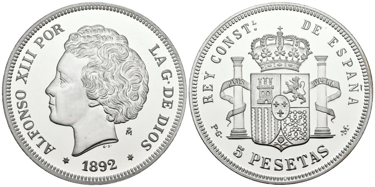 CONTEMPORANEO. 5 Pesetas. (Ar. 43,90g/45mm). 1892. Alfonso XIII. Reproducción actual (años 90) de la FNMT. Perteneciente a la Colección Historia de la Peseta. Madrid. Plata de 925. PROOF.