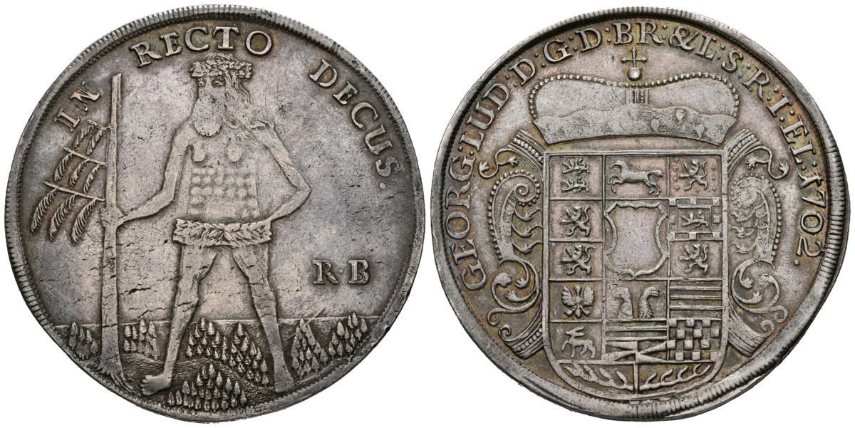 ALEMANIA, George I Ludwig (1698-1714). Thaler (Ar. 29,04g/46mm). 1702. Brunswick-Luneburg. (Davenport 6653). MBC+/EBC. Bonito ejemplar. Bonita pátina.