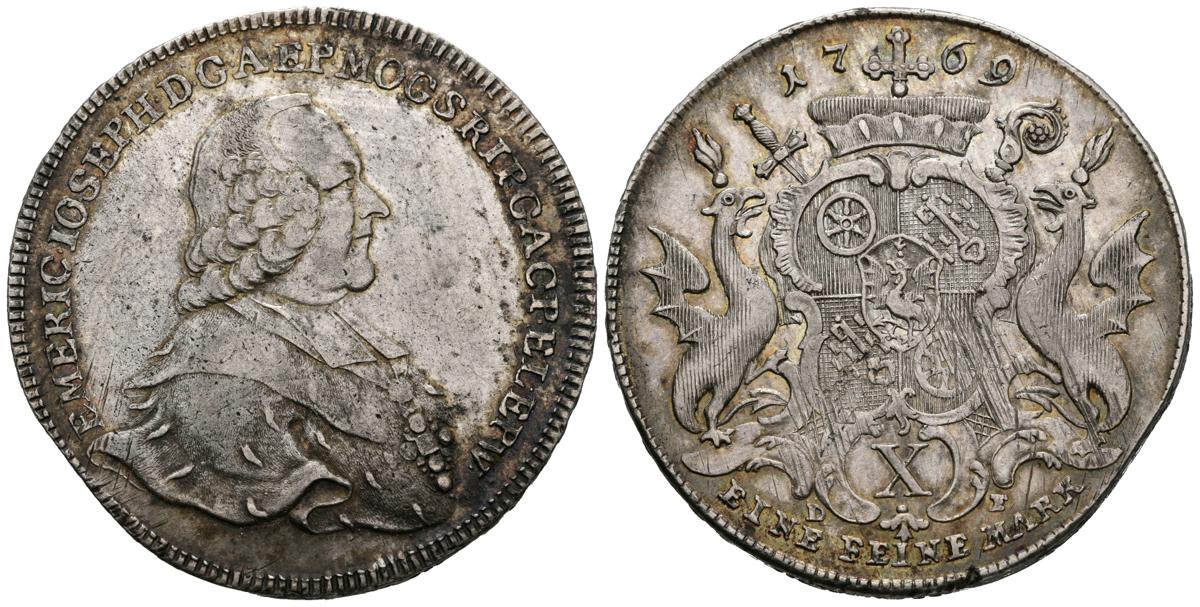 ALEMANIA, Emerich Joseph de Breitbach-Bürresheim (1763-1774). Thaler (Ar. 28,00g/40mm). 1769. Mainz. (Davenport 2427). MBC+. Rayitas. Precioso tono.