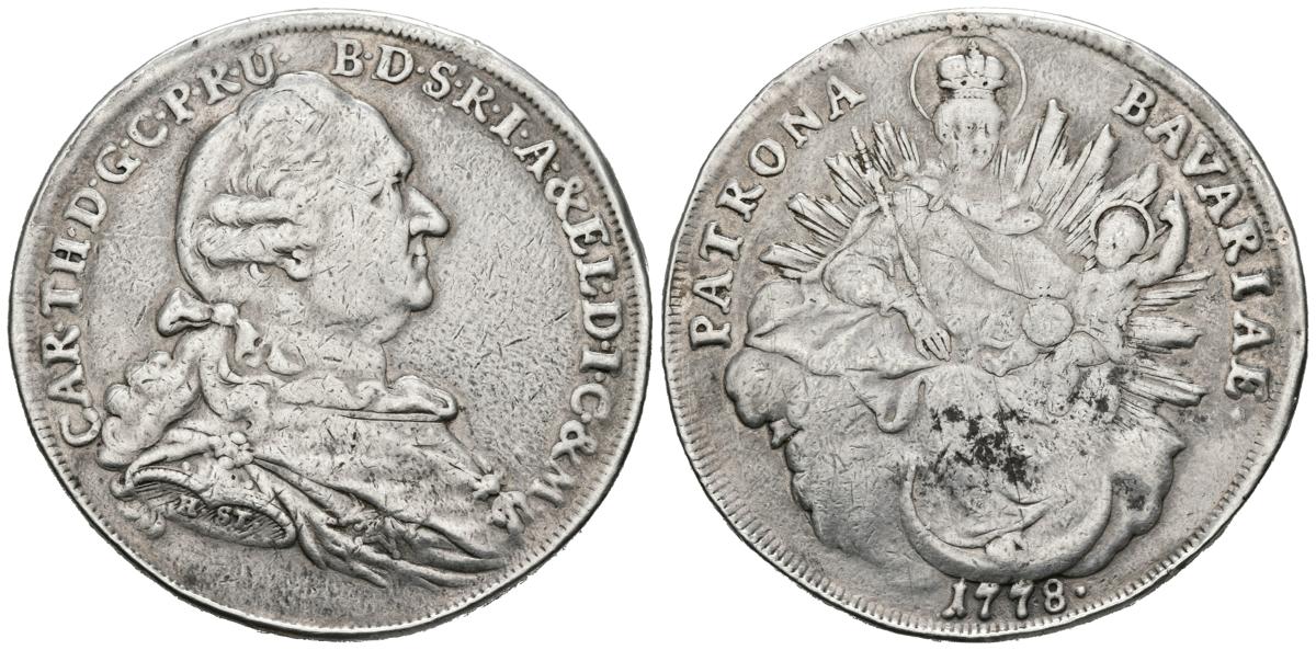 ESTADOS ALEMANES. Baviera. 1 Taler (Ar. 27.77g/41mm). 1778. Carlos Teodoro. Munich. Sin marca de ceca. (Km#563). MBC-. Posiblemente usada como joya.